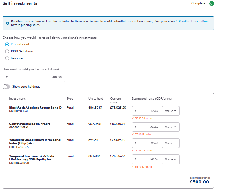 - Proportional Sell Down - Enter the amount you wish to sell, this will then be taken proportionately from funds across the account