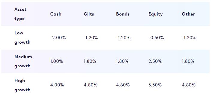 For Other, the rates are set by considering the Bank of England base rate and current long-term interest rates available. Growth rates are inflation-adjusted. We calculate the low, mid, and high growth rate for each asset, allowing for the proportion invested in each asset class.