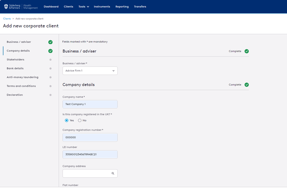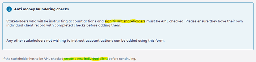 - All significant shareholders of a company and Persons of Significant Control have to be added onto the corporate client has a stakeholder. Significant shareholders and Persons of Significant Control have to be AML checked separately by creating an individual stand alone client record for them:
