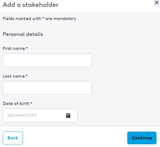 - To setup a stakeholder who isn’t already a client on the platform and does not need to be AML checked, you have to provide, First name, Surname, DOB and address. You will input this from within the stakeholder section of the corporate client creation form: