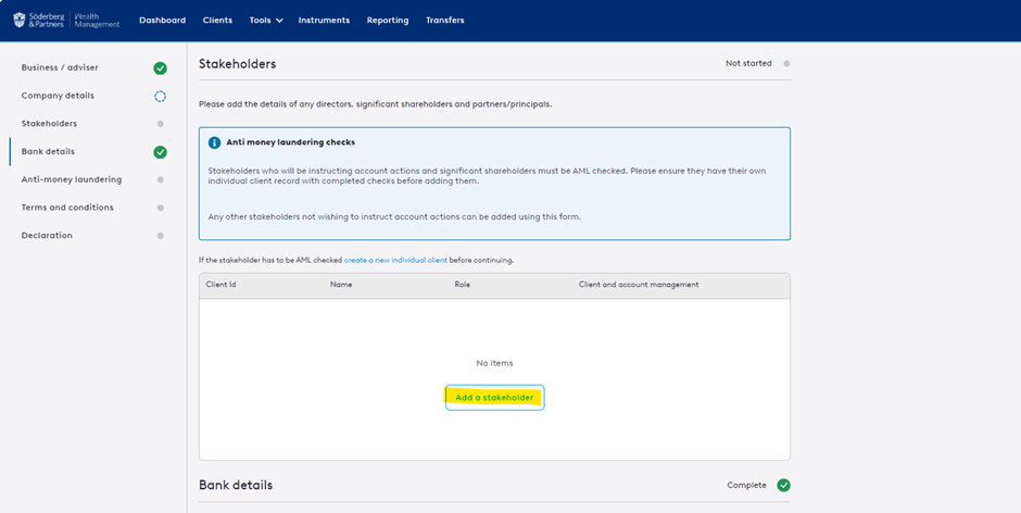 - Unlike significant shareholders, you can add directors and/or principal or partners in as stakeholders but they are not mandatory and do not have to be AML checked unless they will be instructing account actions.
