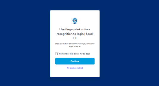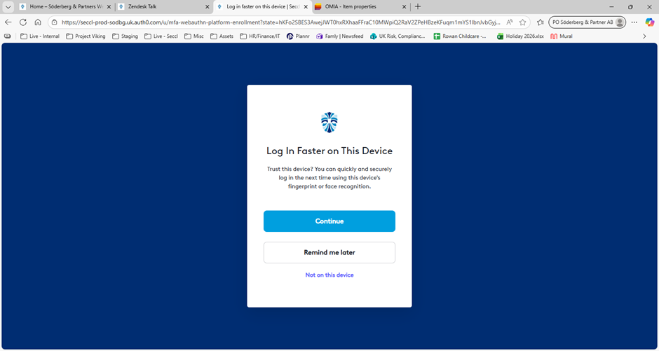 By clicking continue you will be taken in to the journey for setting up facial recognition/fingerprint scanning. Otherwise clicking Remind me later on not on this device will take you in to the platform.