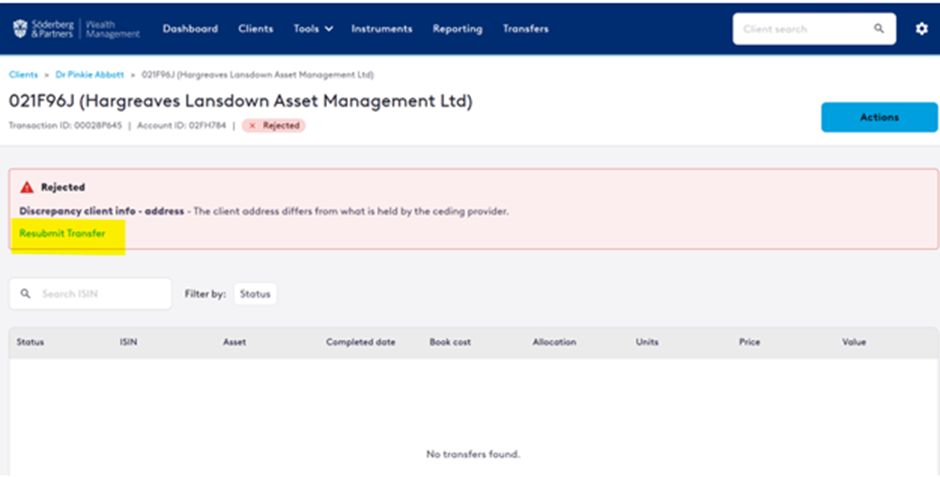 Click into the desired transfer to view the rejection reason. Underneath the rejection reason you will see an option to resubmit the transfer.