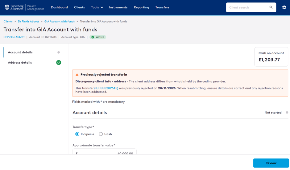 When the information has been updated, click 'Review' and then 'Submit' to submit the updated transfer request. This will remove the transfer from the dashboard tile and create a new transfer. The old rejected transfer will now have an update in the transfer request history section to inform you that it has been resubmitted.