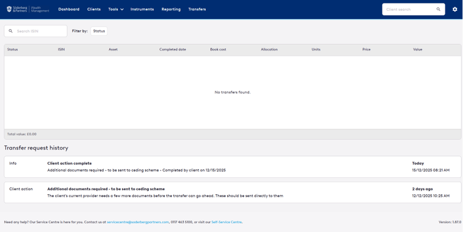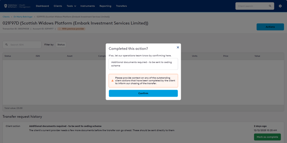 Here is where you are able to let the transfer team know the action is completed so that they can continue to chase the ceding scheme. In this case, the client has to return some documents to the scheme, when completed we would add to the text box ‘Documents returned by client on 15/12/2025’.