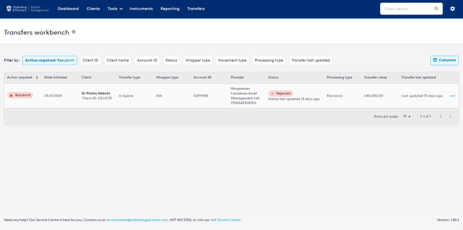 Clicking view on the tiles will take you to a pre-filtered view of the transfer workbench showing you either, transfers that have been rejected that need to be resubmitted, or any outstanding actions on a transfer that must be completed in order for the transfer to progress.