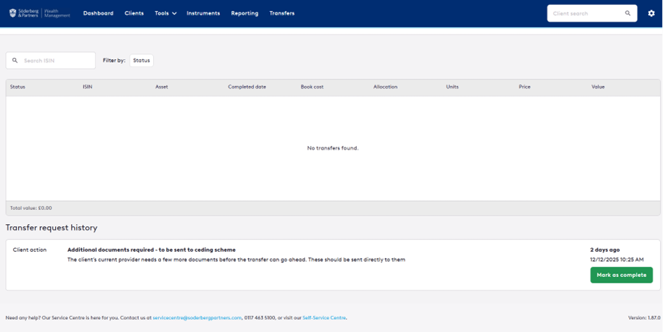 Scroll to the bottom of the page the Transfer request history section to see the outstanding action. Once the action has been completed, press the green ‘Mark as complete’ button.
