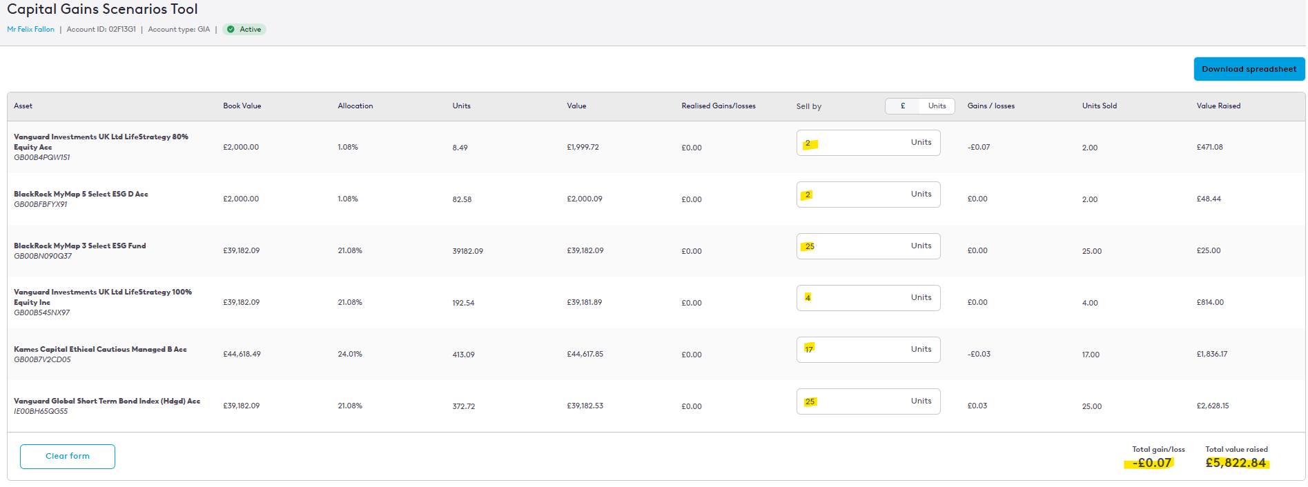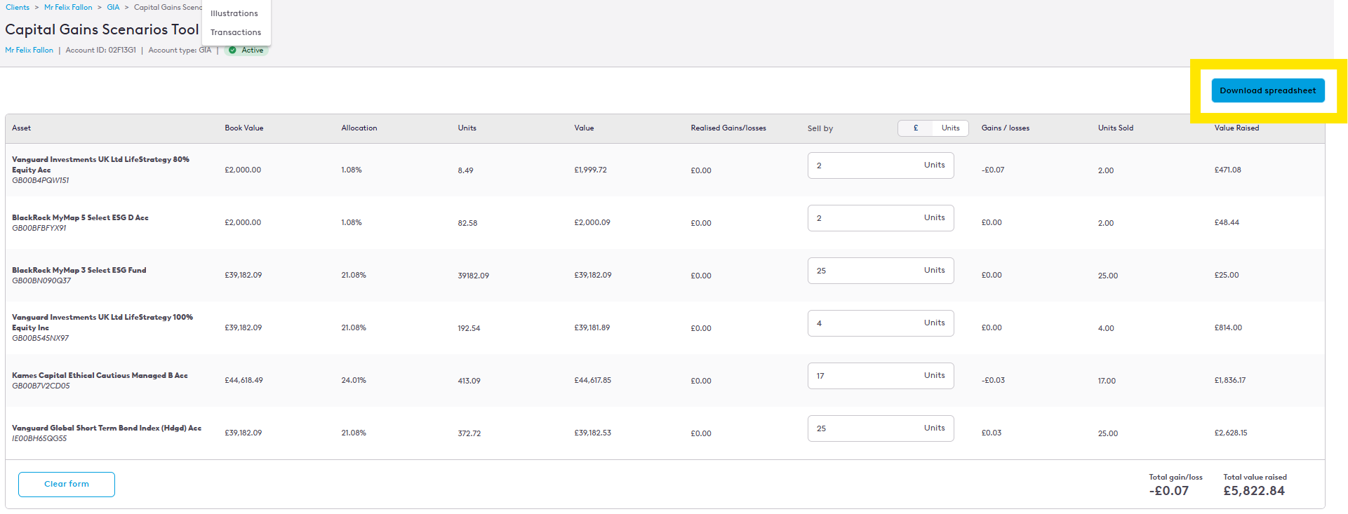 3. You can then select an asset in the clients account, enter the units the client is thinking about selling and you will be met with a total gain/loss at the bottom of the page